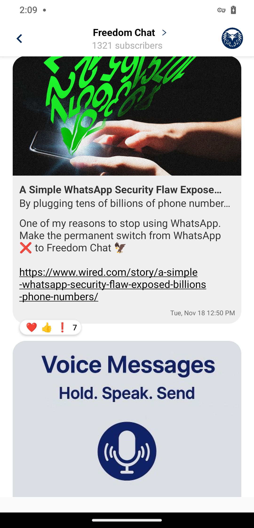 If we scroll back a bit in the Freedom Chat channel, we see this message dunking on WhatsApp: